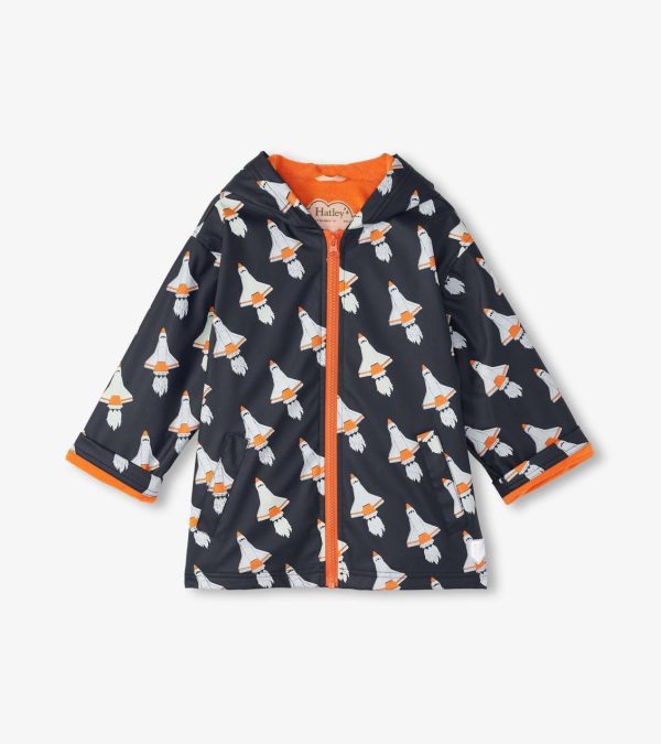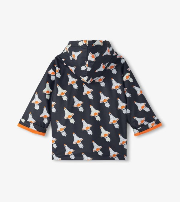 Blast off into rainy adventures with the Boys Space Shuttles Colour Changing Zip-Up Rain Jacket! This jacket doesn’t just keep the rain out – it also changes colors when wet, adding an extra layer of excitement to every rainy day. With its sturdy, waterproof design, your space explorer will stay dry and comfortable.
