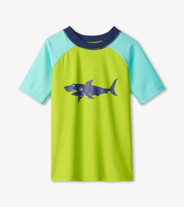 Dive into fun with our Boys Lime Green Shark Short Sleeve Rashguard. Made from a mix of nylon and spandex, this rashguard is both protective and flexible, ideal for your little shark hunter. The vibrant lime green colour and shark print are bound to make a splash at any pool party.