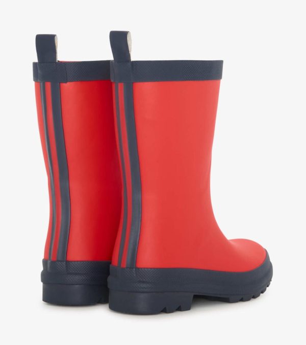 Puddles beware! These waterproof and PVC-Free red and navy matte rain boots are handmade from durable, slip-resistant rubber, ensuring your little ones feet stay dry and comfortable. Ready to make a big splash, these boots are a must-have for rainy day adventurers.