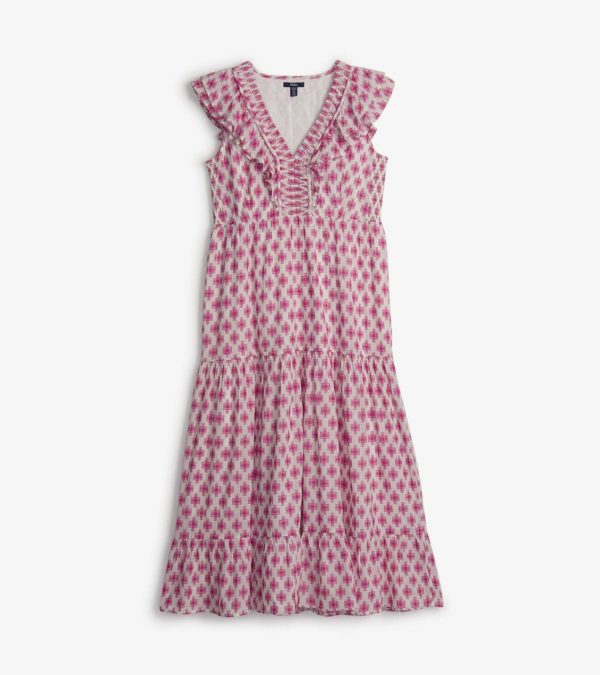 An empire waistline and tiered skirt give this midi dress a graceful fit and fluttery feel. The fully lined bodice flatters with two layers of ruffles meeting at the center V-neck, while the drapes are enhanced by soft smocking details at sides.
