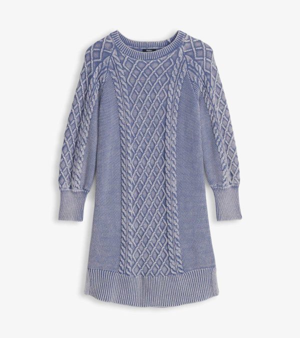 The Juliet cable knit dress in bleached denim is a modern take on a classic silhouette. Crafted from comfortable cotton, this dress features intricate cable knit detailing that enhances its timeless appeal. The cool, bleached denim hue makes it a versatile piece that can be dressed up or down.