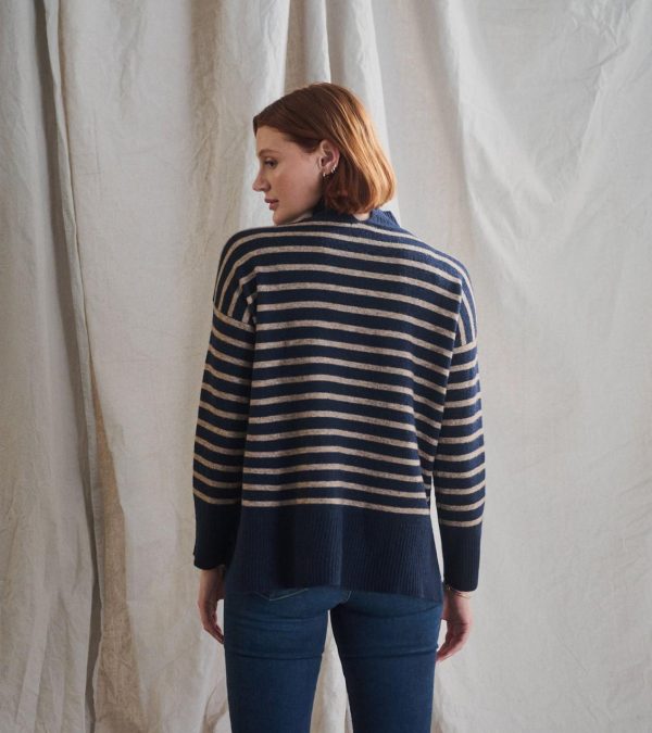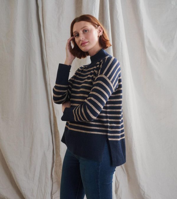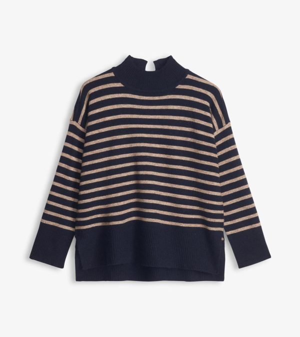 Crafted from a rich blend of acrylic, polyester, and camel, the mock neck tunic in navy taupe stripes offers a luxurious feel and a striking look. The striped pattern is both bold and sophisticated, while the mock neck and tunic length provide warmth and coverage. Perfect for pairing with leggings or slim pants.