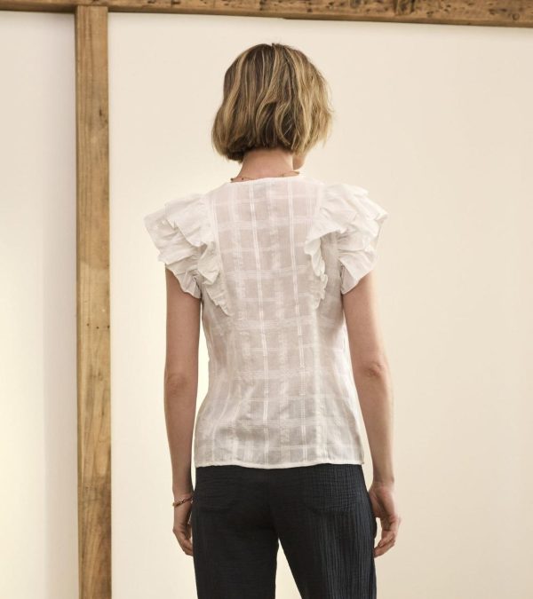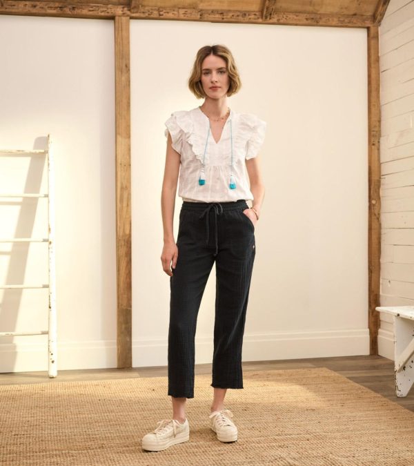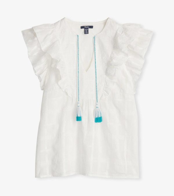 This lightweight Alexa popover top with feminine ruffles and tassels, is the epitome of breezy style. Featuring an open neckline, decorative ties finished with handcrafted tassels.