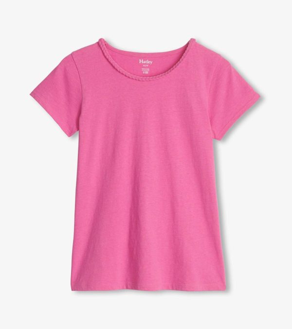 Elevate your casual wear with the Braided Neck Tee in Phlox Pink. Crafted from a blend of cotton and linen, this tee offers unparalleled comfort and a lightweight feel. Its unique braided neckline adds a subtle yet stylish detail, setting it apart from your average tee!