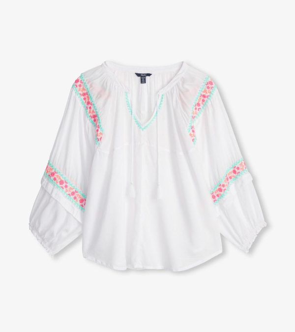 Our Naomi blouse offers sophisticated style with a hint of boho appeal. Embroidered details, playful tassels and beads on the neckline and long raglan sleeves make this top truly special. This is an easy, relaxed shape made from natural-coloured oxford cotton that’s designed to work perfectly with pants or skirts. Fit: This blouse runs big, we suggest choosing a smaller size than what you normally wear.